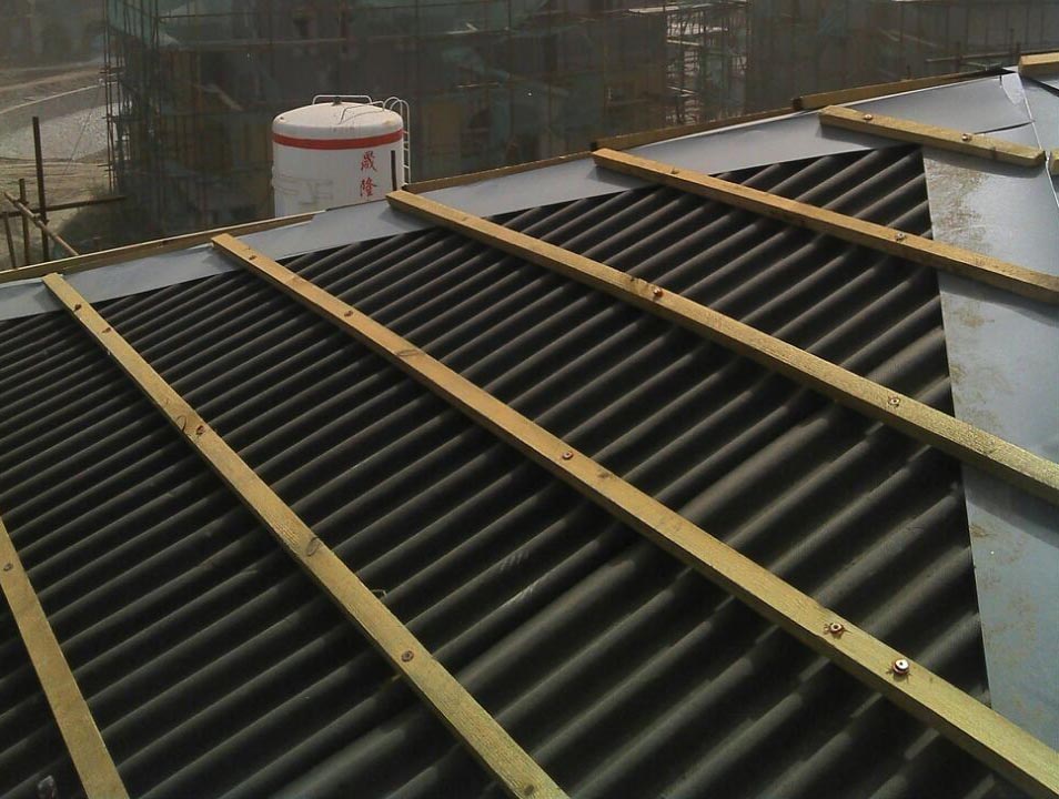 ·剛?cè)岵?jì):波形瀝青防水板平放在混凝土基層上時(shí),抗壓強(qiáng)度可達(dá)2t/m2,可減少因交叉作業(yè)引起的材料損壞和質(zhì)量事故,易于保證屋面整體系統(tǒng)的施工質(zhì)量11